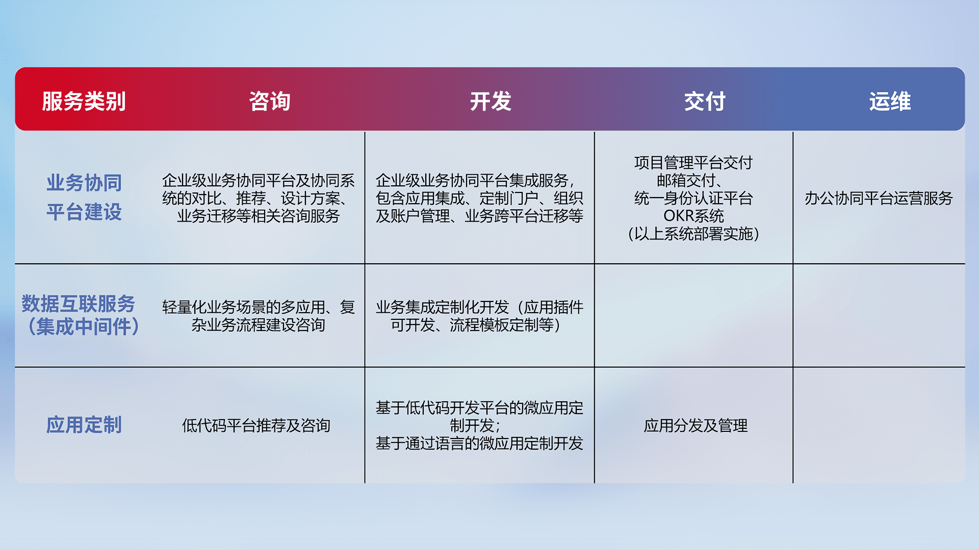 针对钉钉、、、企微、、、IDaas等平台级产品提供产品的规划、、、、方案、、、、交付、、定制化开发等服务,,,,实现如统一协同办公、、、、智能客户服务、、混合会议管理、、智能数据查询、、、等业务场景,,,实现数字化转型。。